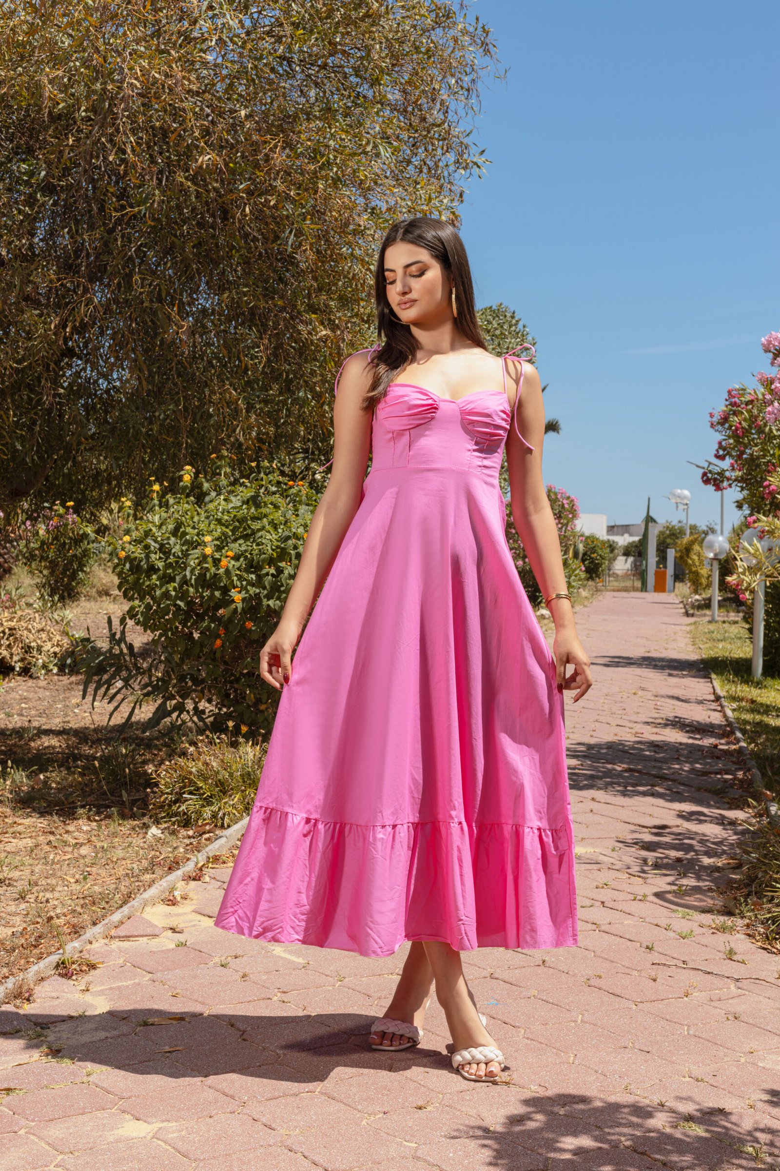 Robe à bretelles fines nouées, avec un bustier froncé et une coupe évasée. Légère et féminine, elle est parfaite pour les journées ensoleillées.