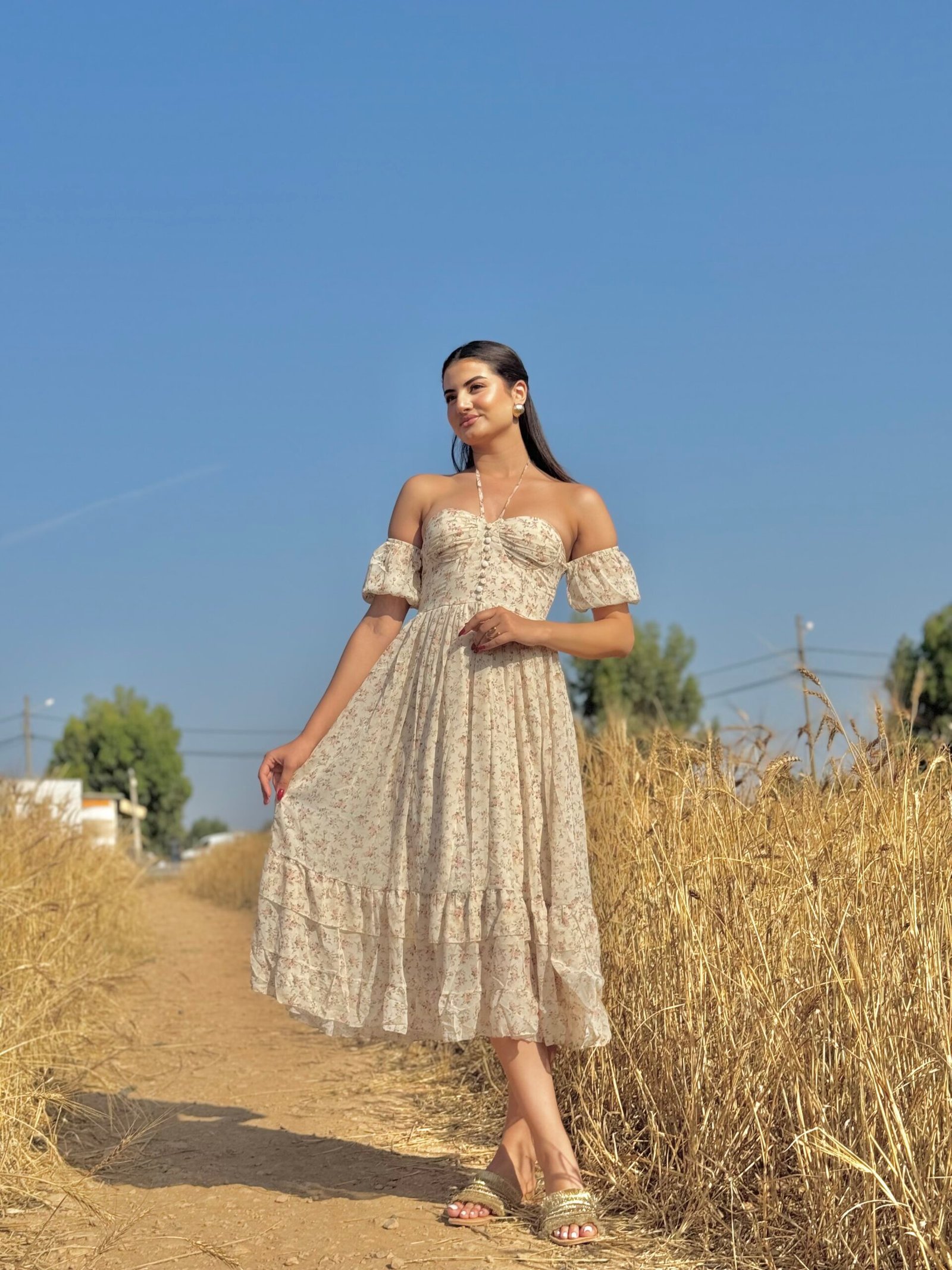 Cette robe légère à imprimé fleuri allie charme vintage et féminité. Son bustier à boutons et ses manches bouffantes tombantes subliment la silhouette avec douceur. Parfaite pour vos balades d’été ou une occasion romantique à la campagne.