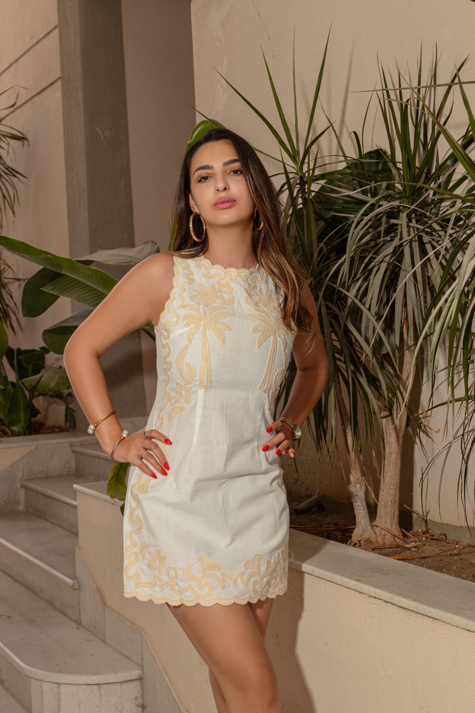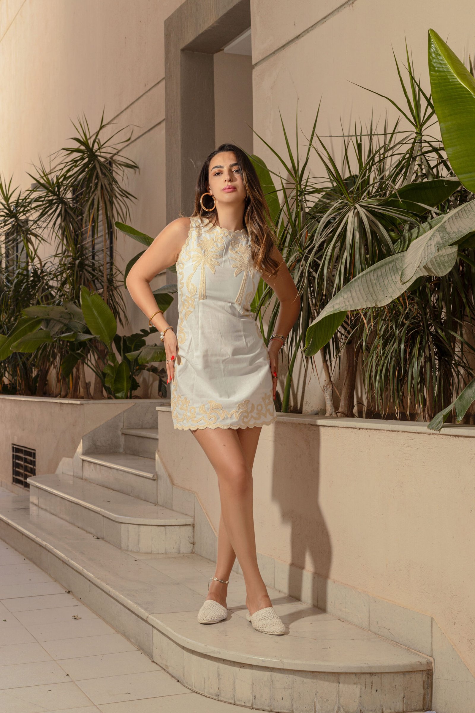 Robe courte sans manches avec des broderies beiges délicates. Le motif floral et les palmiers apportent une touche élégante et estivale. Coupe droite, col rond.