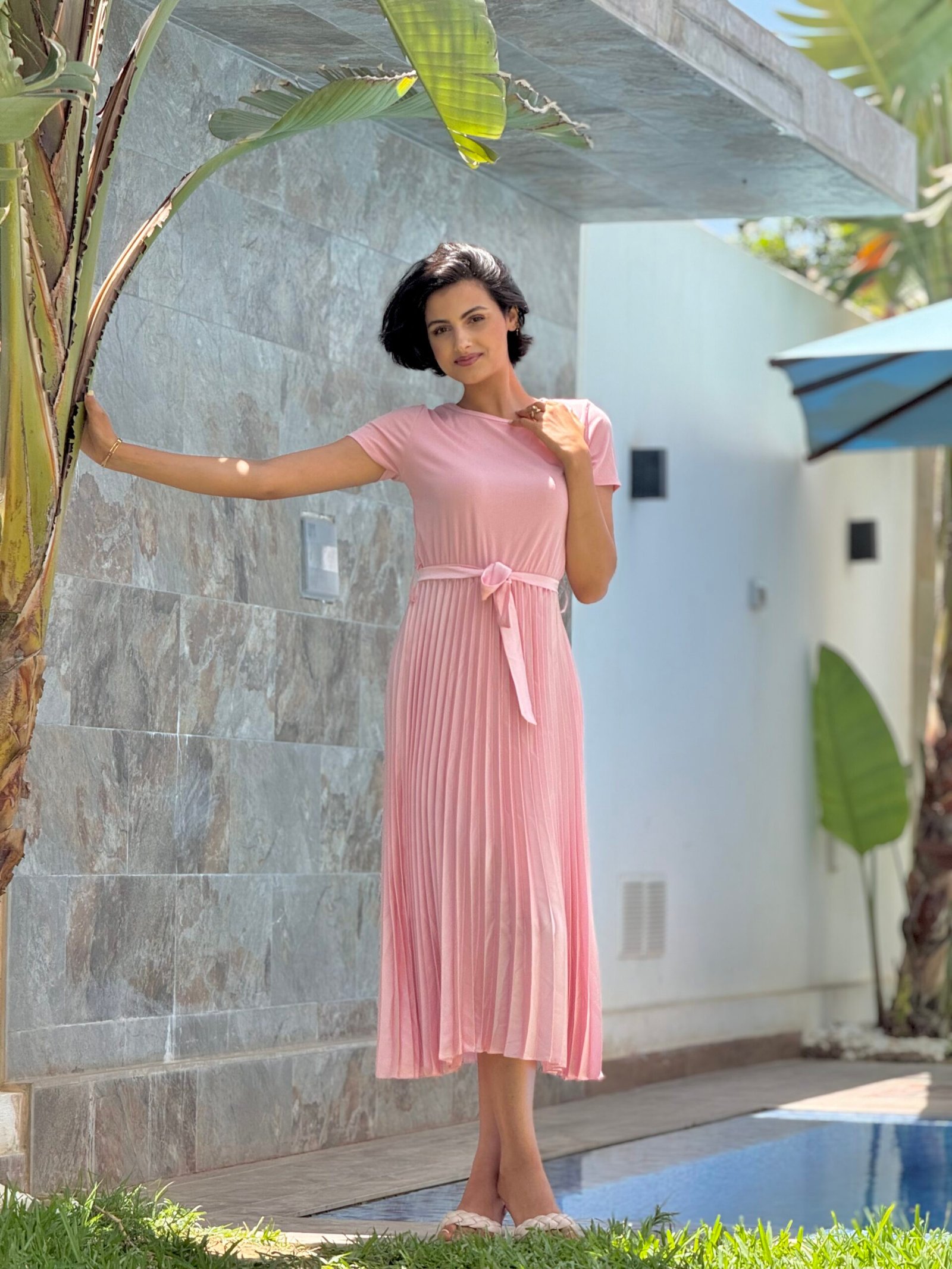 Craque pour cette robe rose poudrée à manches courtes et taille ceinturée, alliant structure et fluidité. Les plis délicats apportent du mouvement à chaque pas, tandis que le tissu doux souligne ta silhouette avec élégance. Une robe intemporelle à porter au quotidien comme pour un événement spécial.