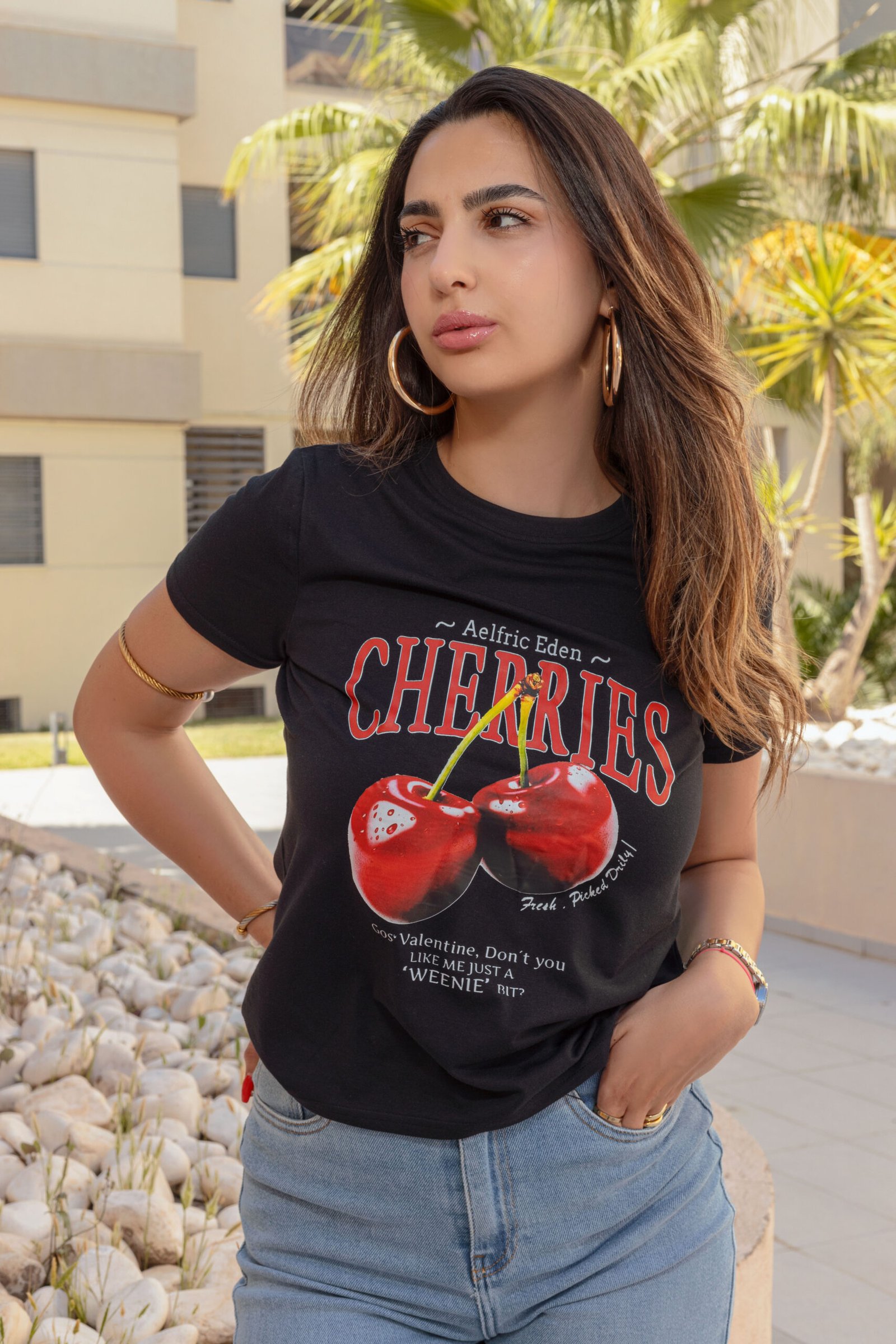 T-shirt noir au style vintage et audacieux, orné du motif cerises « Cherries – Aelfric Eden ». Son imprimé rouge vif et son message décalé ajoutent une touche rebelle et originale au look.